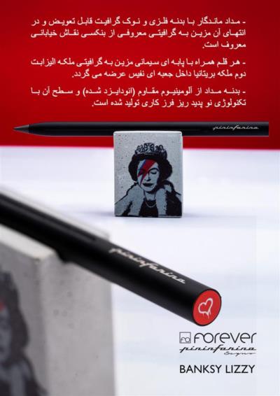 - هر قلم همراه با پابه ای سیمانی مزین به گرافیتی ملکه الیزابت دوم ملکه بریتانیا داخل جعبه ای نفیس عرضه می گردد.
